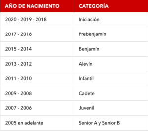 La categoría correspondiente dependerá del año de nacimiento del jugador/a.